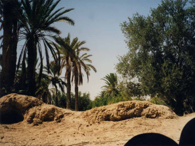 Die letzten Kilometer durch die Oase fühlen wir uns wie im Paradis: Über unseren Köpfen weht der Wind durch mächtige Dattelpalmen und der Weg ist gesäumt von Büschen aller Art.Wir stellen unser Zelt in einer ruhigen Ecke (hier wimmelt es von Touristen) auf, geniessen eine warme Dusche und eine eiskalte Cola.