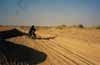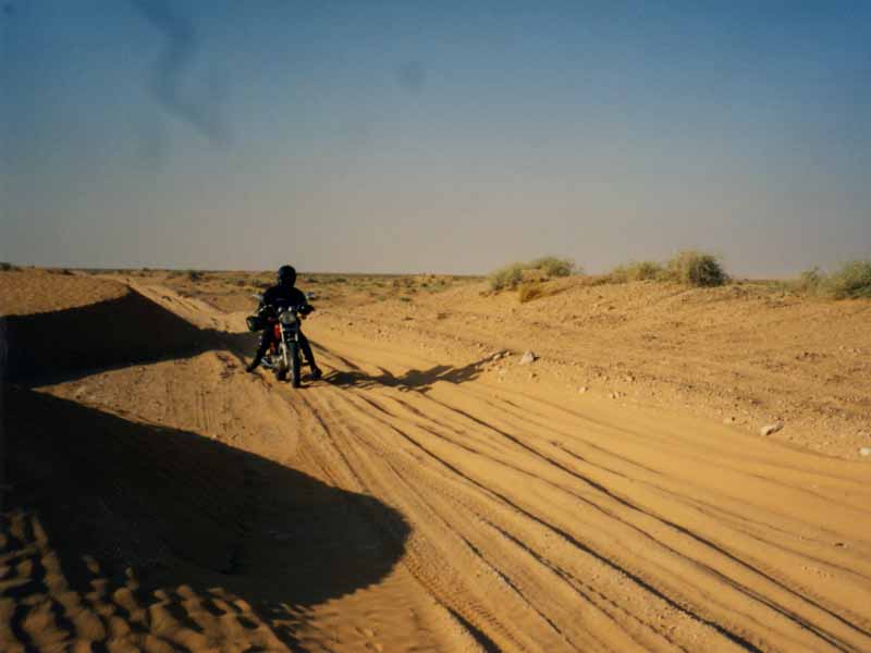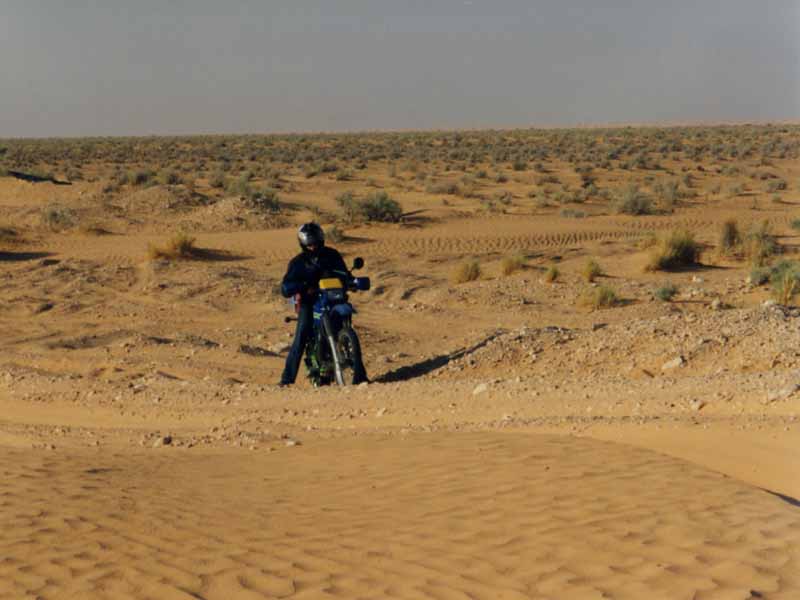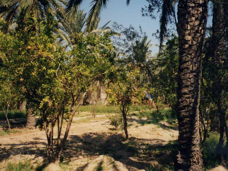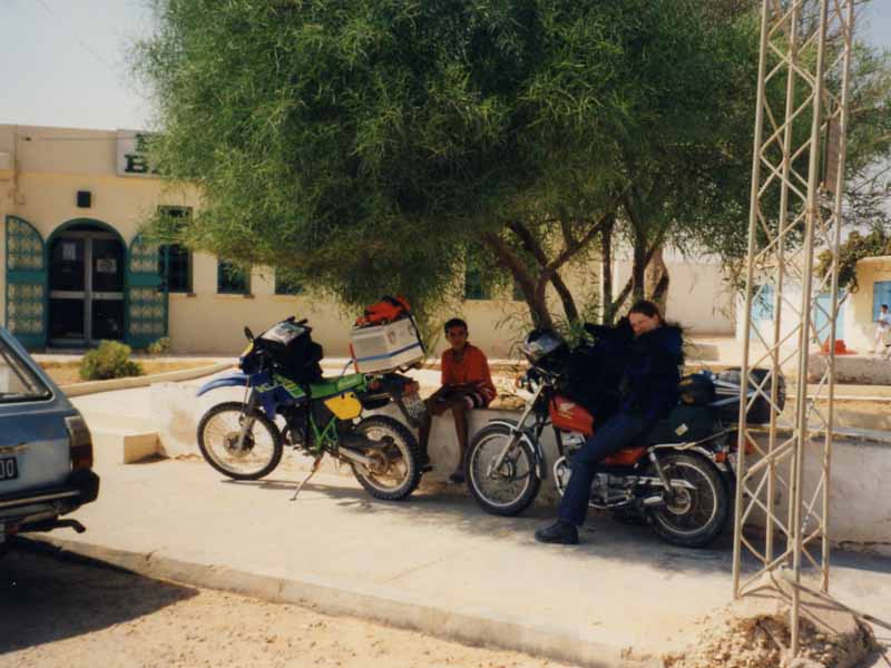 Im Wissen, dass die Banken um 11.00 schliessen (und danach während des islamischen und anschliessend des christlichen Wochenendes geschlossen bleiben), stehen wir um 05.00 auf und verlassen Ksar Ghilane um 05.45. Um wenige Minuten verpassen wir den Sonnenaufgang. Wir kommen zügig voran, so zügig, dass wir sogar verpassen, die übelsten Verwehungen auf der Piste zu fotografieren. 20 km vor Matmata steht plötzlich ein Anhalter auf der Strasse. Kaum im zweiten Gang verliehrt er eine Sandale. Er spricht nicht französisch, ich verstehe kein arabisch, so dass wir erst ziemlich spät zum einsamen Schuh zurückkehren. Um 10.00 können wir in Matmata Nouvelle endlich unseren finanziellen Notstand beheben. Vor Gabès machen wir Rast in einer herrlichen Oase. Sie wird in drei Etagen bewirtschaftet: Zuoberst spenden Dattelpalmen Schatten, in der Mitte wachsen Granatäpfel, Feigen, Trauben und sogar Pfeffer während direkt auf dem Boden Melonen und Gemüse angebaut wird. Während wir im Schatten dösen, taucht ein kleiner Junge auf, der uns mit Granatäpfeln und Trauben beschenkt. Kurz bevor wir aufbrechen wollen, erscheint sein Vater und bietet uns Unterkunft in seinem Haus an. Anders als unsere Freunde von Enfida lässt er uns ohne Enttäuschung ziehen und wünscht uns eine gute Reise.